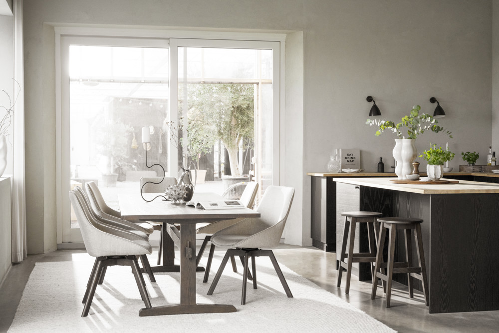 Populära Alison stol med träunderrede och snurrfunktion. Här syns den i ett tåligt ljusbeige tyg och med ben i lackad brun ek. Alison har en stoppad sits med hög sittkomfort i kupad design och ben med snurrfunktion i 360 grader. Stolen passar perfekt runt matbordet men även som udda stol till skrivbordet. Alison är FSC®-certifierad och finns även i andra jordnära färger. Säljs endast i 2-pack.