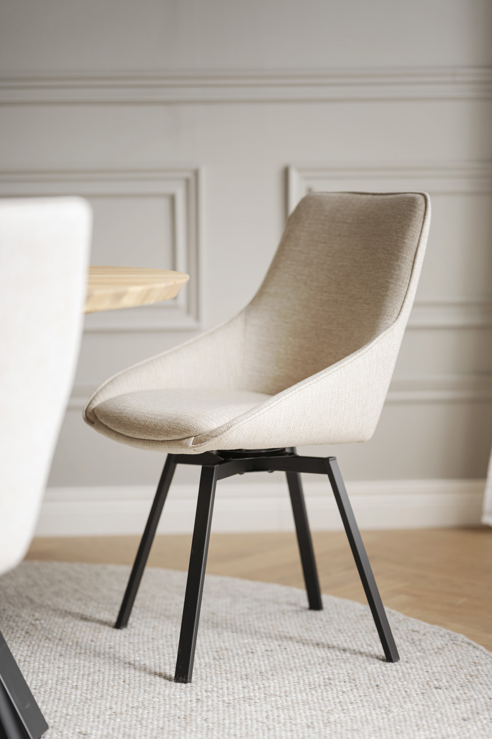 Populära Alison stol med underrede som har snurrfunktion. Här syns den i ett tåligt ljusbeige tyg och med ben i pulverlackad svart metall. Alison har en stoppad sits med hög sittkomfort i kupad design och ben med snurrfunktion i 360 grader. Stolen passar perfekt runt matbordet men även som udda stol till skrivbordet. Alison är FSC®-certifierad och finns även i andra jordnära färger.