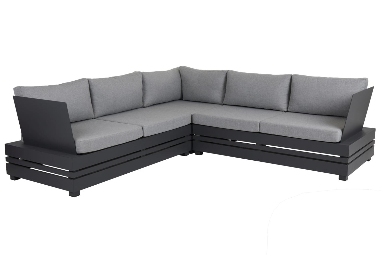 Byggbar soffa i antracitfärgad aluminium med dynor i olefintyg. Avsedd för utomhusbruk.