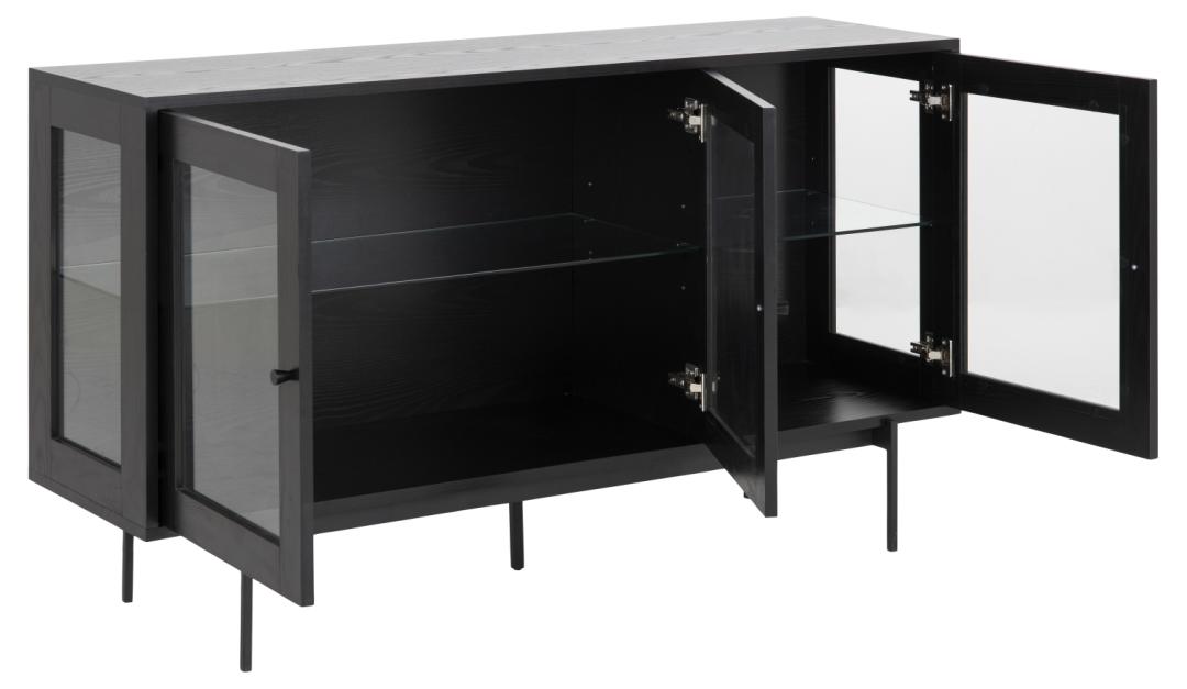 Angus skänk, ram och 2 hyllplan klarhärdat glas, topp ask svart grov melamin, 3 dörrar klart härdat glas och ask svart grov melamin, bas matt svart grovt pulverlackerat stål, 140x40x82 cm