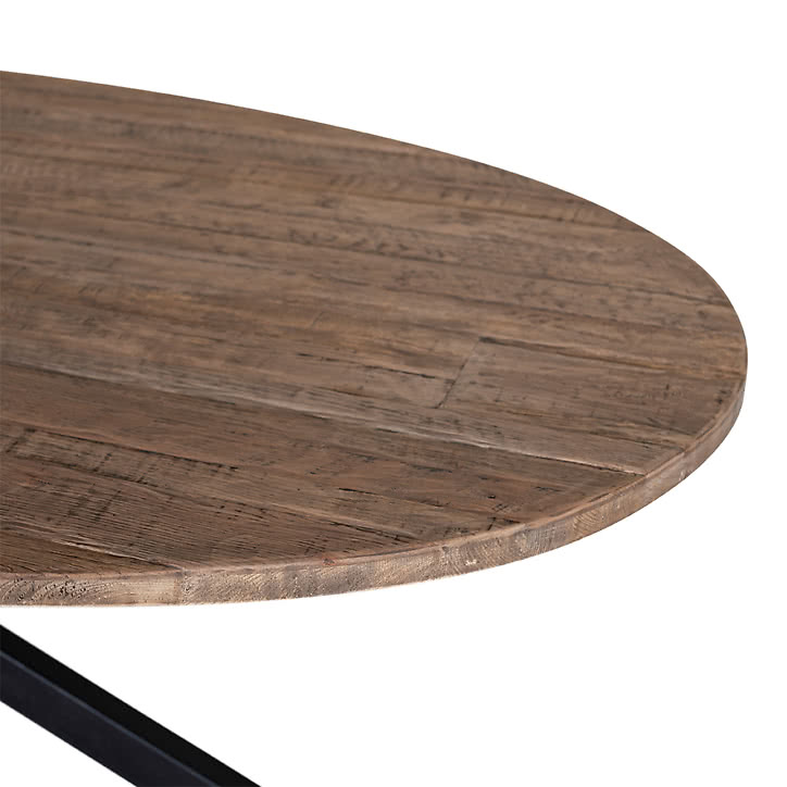 Den ovala skivan är i naturfärgad, återvunnen ek och benen i svart metall.