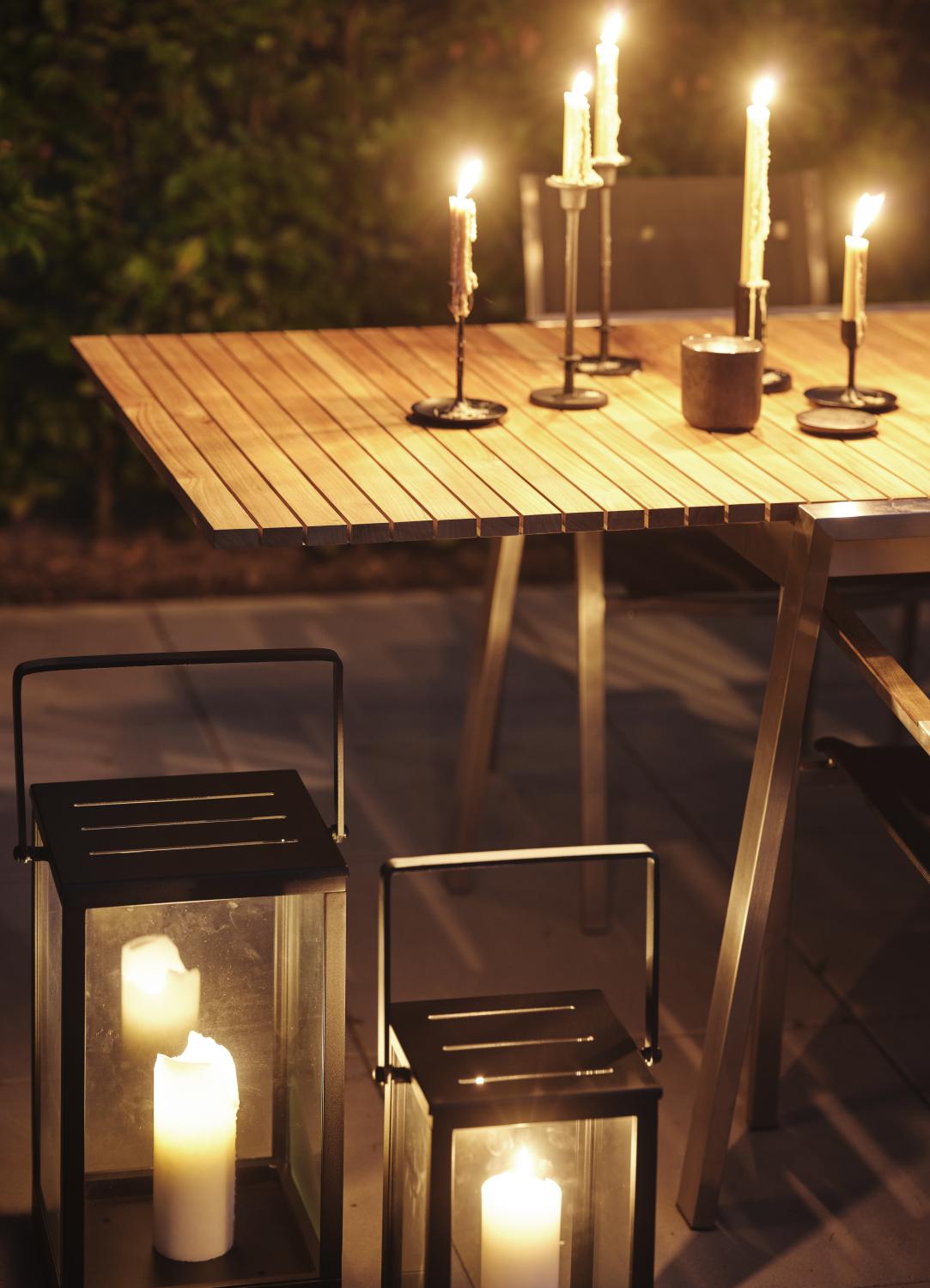 Modern ljuslykta i mattlackad aluminium med praktiskt och dekorativt handtag.