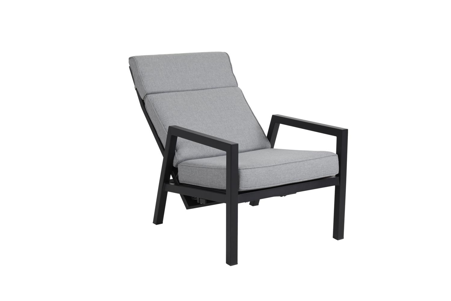 Positionsfåtölj i svartlackad aluminium inklusive väderbeständiga dynor i grått olefintyg.