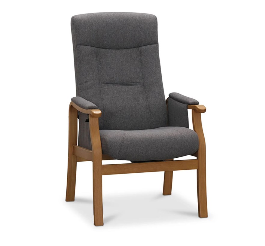 Seniorfåtölj i mörkgrått tyg med underrede i lackad ek.