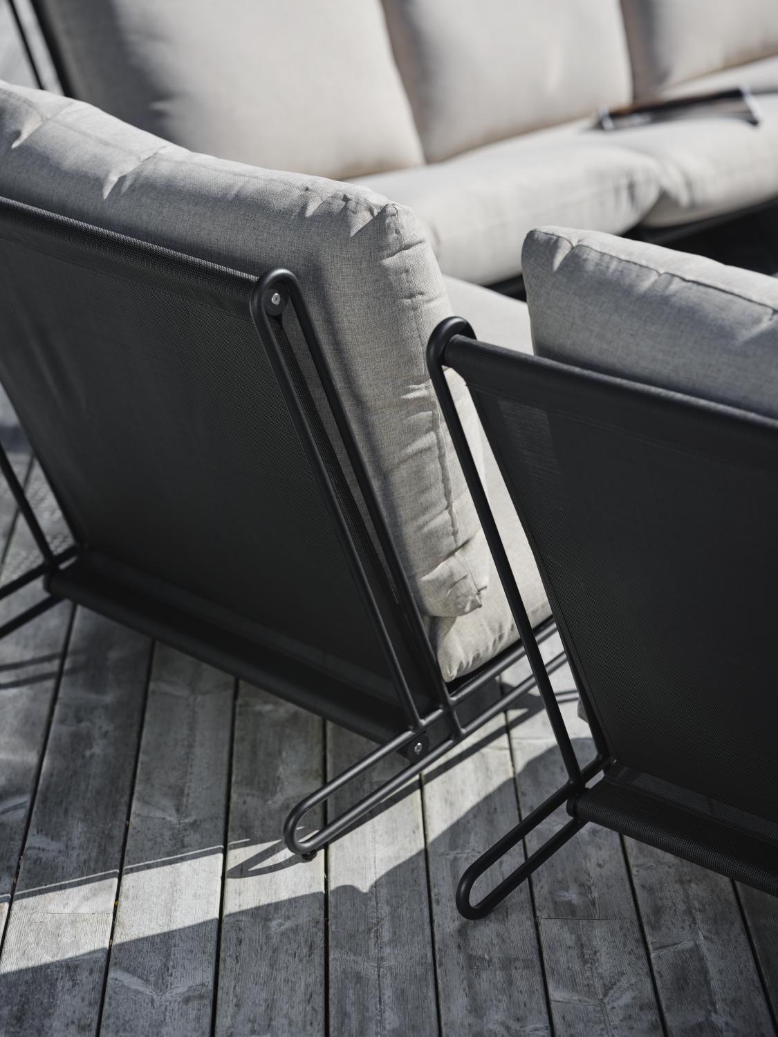 Modern, utbyggbar och snygg. Blixt är de sköna loungestolarna som fångar blickarna antingen som ensamma fåtöljer eller utbyggda till soffor. Det är bara att välja, de fräcka vinklarna – som också ger god komfort – passar in överallt. Stommen är i aluminium och de snygga dynorna har vattenavvisande olefintyg med liner.