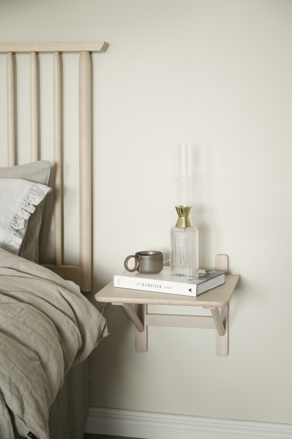 Camrose sängbord i vitpigmenterad ek ger sovrummet ett elegant uttryck. Placeringen på väggen anpassas enkelt efter sängens höjd vilket gör att sängbordet passar till alla sängar. Camrose sängbord matchas utmärkt med sänggaveln Riggins i samma färg. Camrose finns även i svart ek.