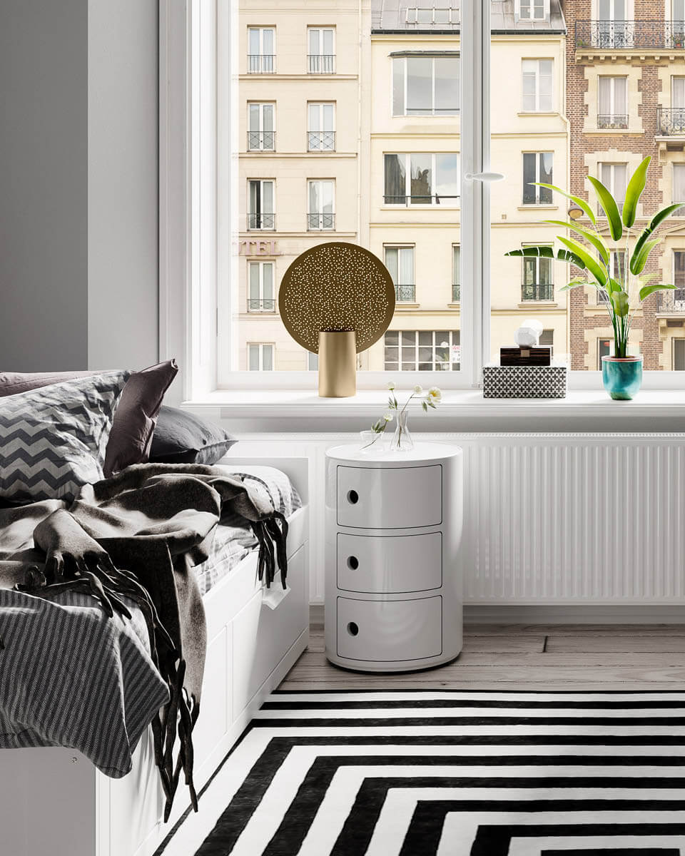 Colby bordslampa är det senaste tillskottet i den populära Colby-familjen. Lampan har en enkel metallfotscylinder och en ståtlig platta likt en aura upptill. Plattan har dessutom en vacker mönsterbild som ger lampan det lilla extra. Det som är extra finurligt med Colby bordslampa är att den går att ha på två olika håll och att den då upplevs som två helt olika lampor – med plattan framtill eller baktill! Av denna anledning har vi valt att placera sladden till sidan om lampan, för att du själv ska kunna välja vilket håll du vill att lampan ska vara på. Detta gör även att lampan alltid kommer vara snygg utifrån om du väljer att ställa den i ett fönster! Colby bordslampa finns i tre olika färgställningar: svart, guld och vit. Till lampan behöver du en ljuskälla med sockel E27, med en omkrets på 60mm. Till Colby passar både en ljuskälla i klarglas och amberfärg – välj det sken du gillar bäst!