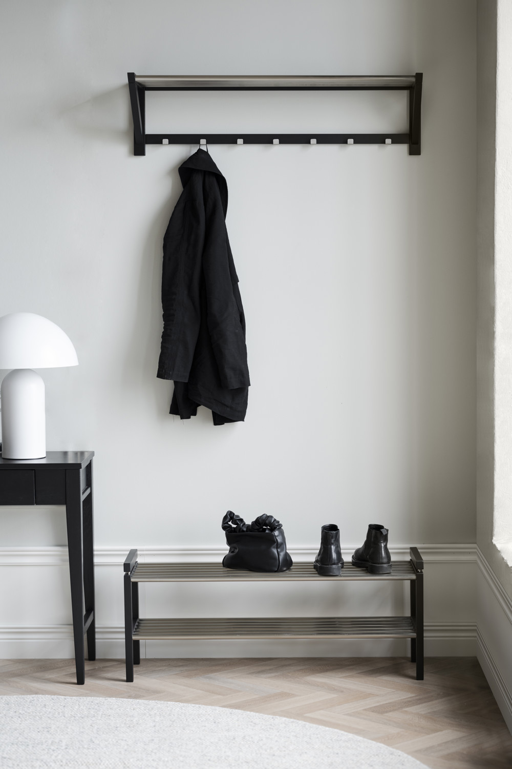 Confetti hatthylla massiv och svartlackad ek. Hatthyllan är både praktisk och modern med 7 st snygga krokar i metall. Hatthyllan ingår i hallserien Confetti.
