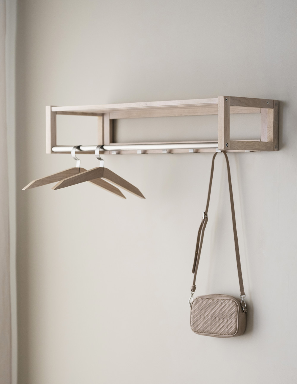 Confetti hatthylla massiv och svartlackad ek. Hatthyllan är både praktisk och modern med snygga krokar i metall. Hatthyllan ingår i hallserien Confetti.