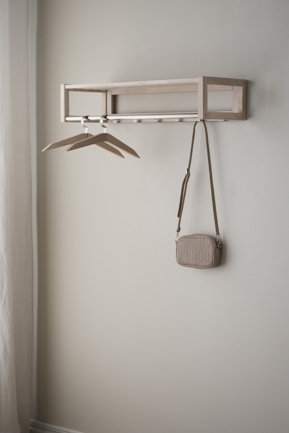 Confetti hatthylla massiv och vitpigmenterad ek. Hatthyllan är både praktisk och modern med snygga krokar i metall. Hatthyllan ingår i hallserien Confetti.