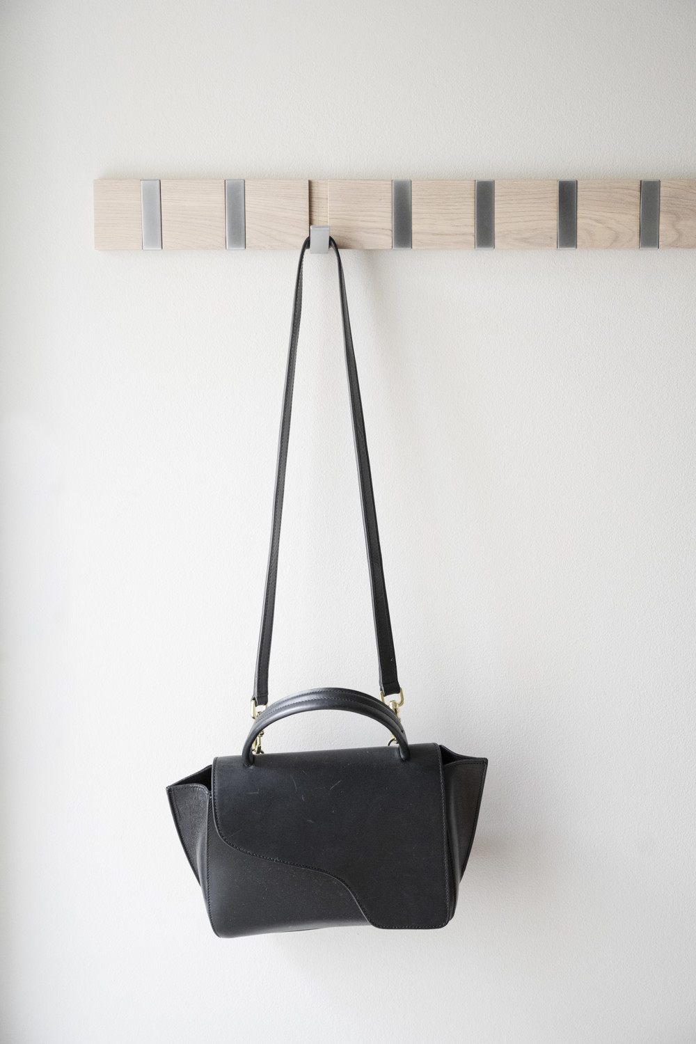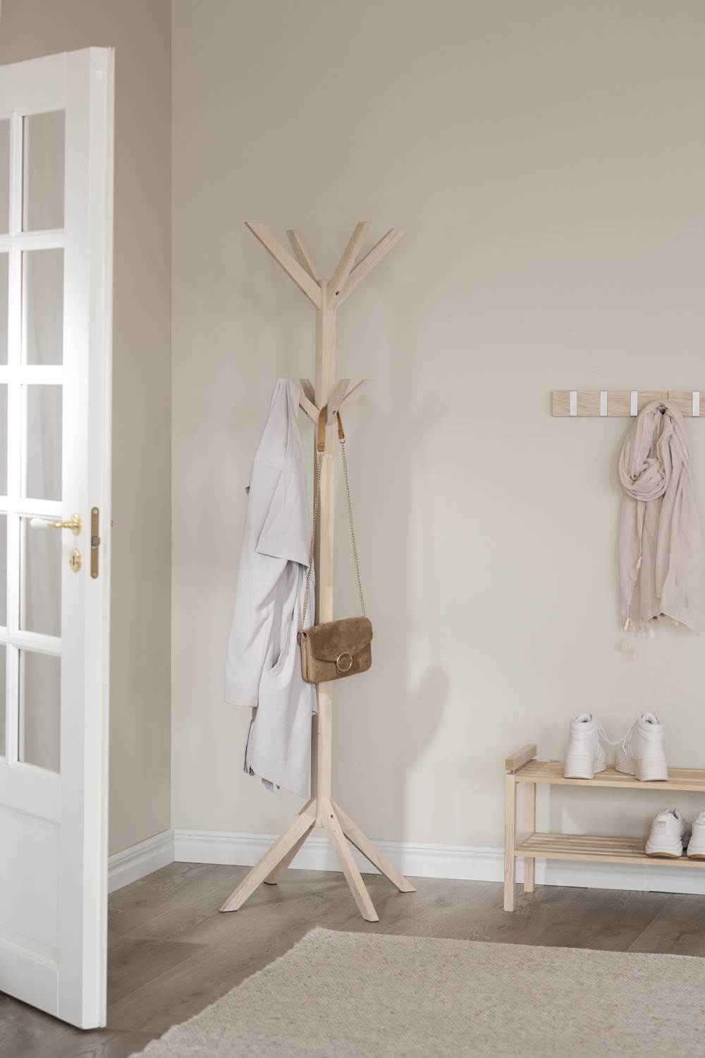 Confetti klädhängare i massiv vitpigmenterad ek. Åtta stilrena och utfällbara metallkrokar. Klädhängaren ingår i hallserien Confetti.