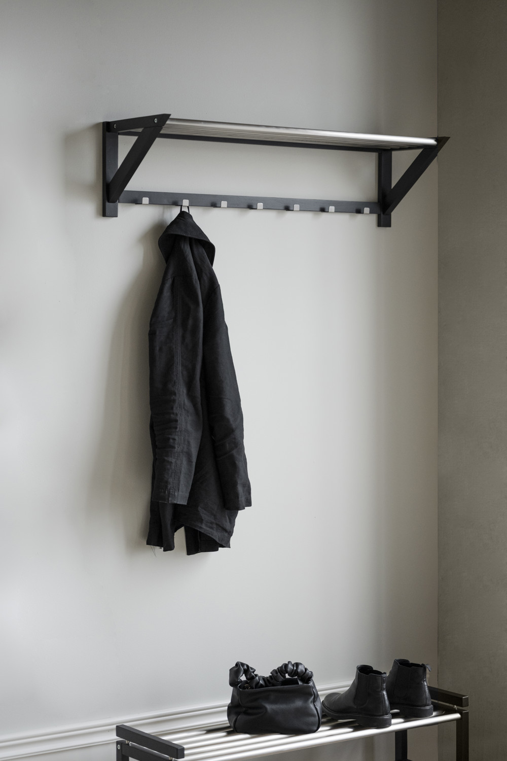 Confetti skoställ i massiv och svartlackad ek. Dekorativa ribbor i metall. Stilren och enkel att placera. Skostället ingår i hallserien Confetti.