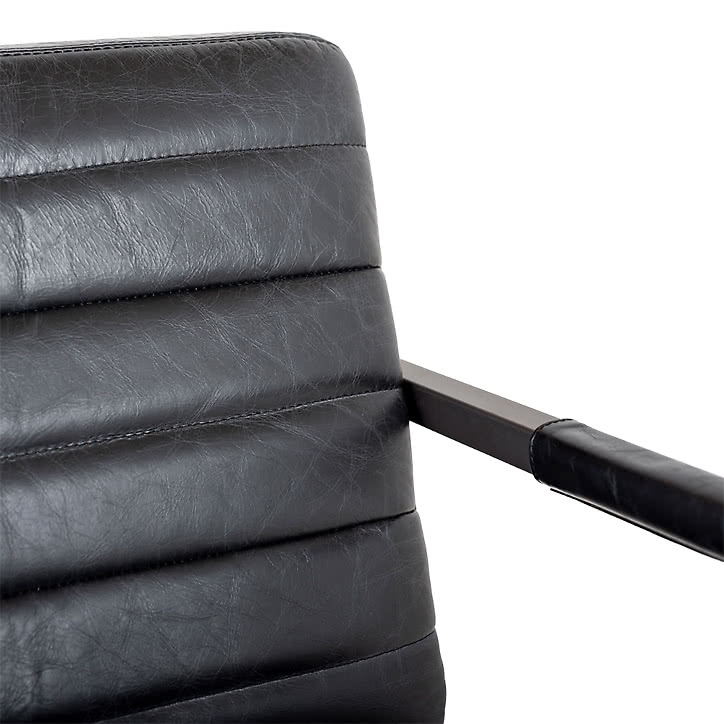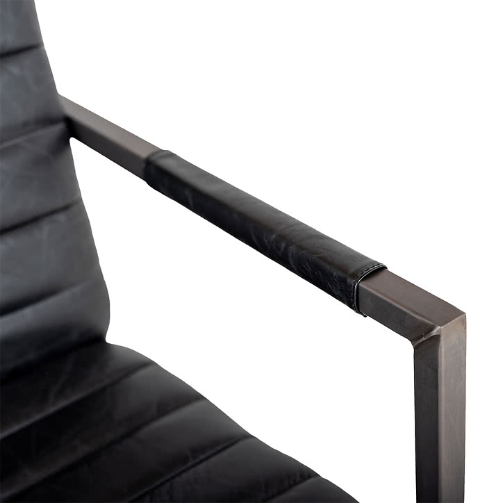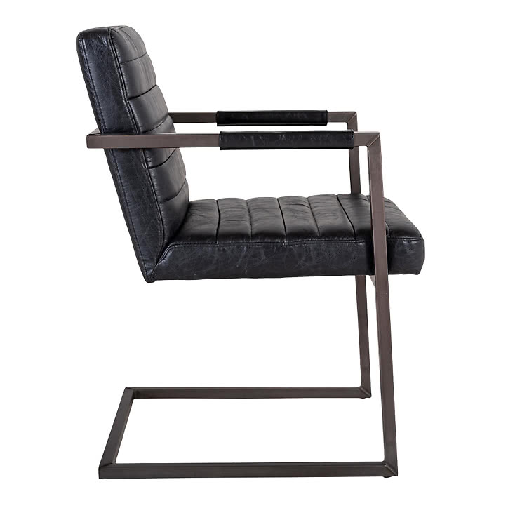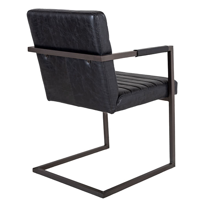 Robust karmstol som andas vintage med snygga detaljer i skinn. Ram av metall.