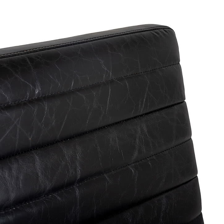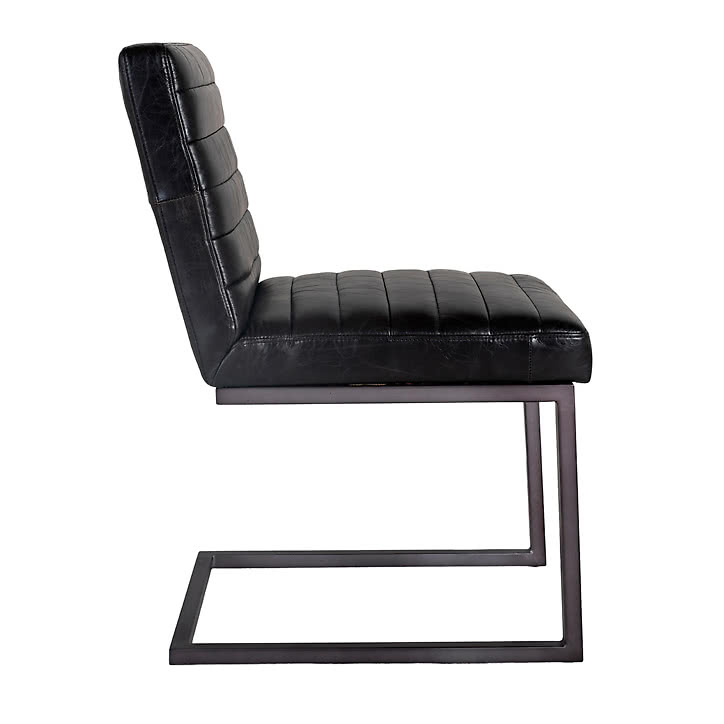 Matstol i vintageanda med svart läder och underrede i metall.