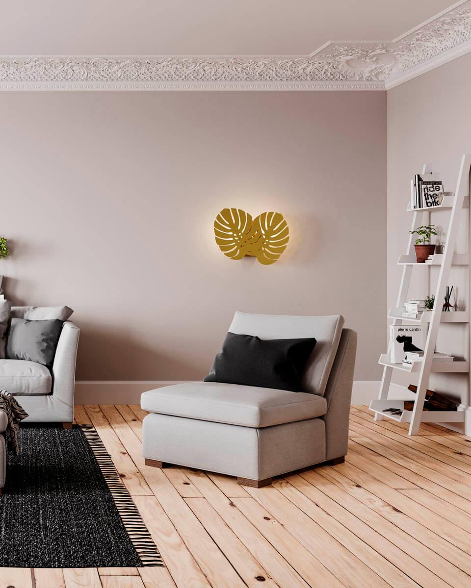 Costa Rica är en formgiven vägglampa av Monica Nagy. Det vackra monsterabladet i matt mässing för tankarna till Art Deco. Vägglampan består av två blad som korsar varandra. Denna vackra vägglampa har en bredd på 64 cm och en höjd på 47 cm.Monica berättar att idén till Costa Rica föddes på en promenad i trädgården, där hon gick och drömde sig bort. Inspirationen kommer från svunna epoker och upplevelser från härliga resor. Till Costa Rica vägglampa behöver du två ljuskällor med G9 sockel. Glöm inte lägga till ljuskällor i din varukorg.