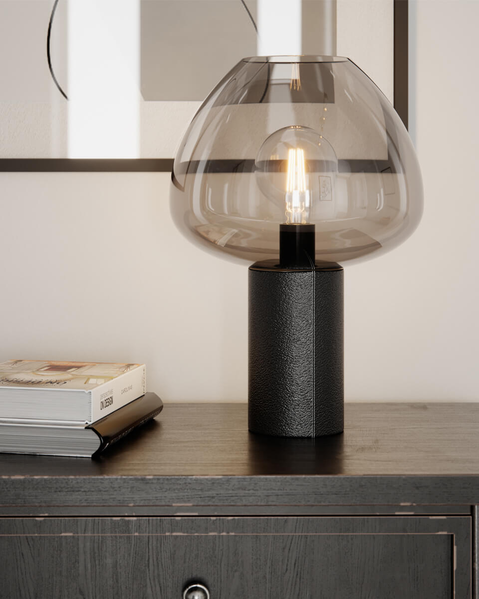 Cozy bordslampa finns i färgerna grå och konjak på glaskupan.