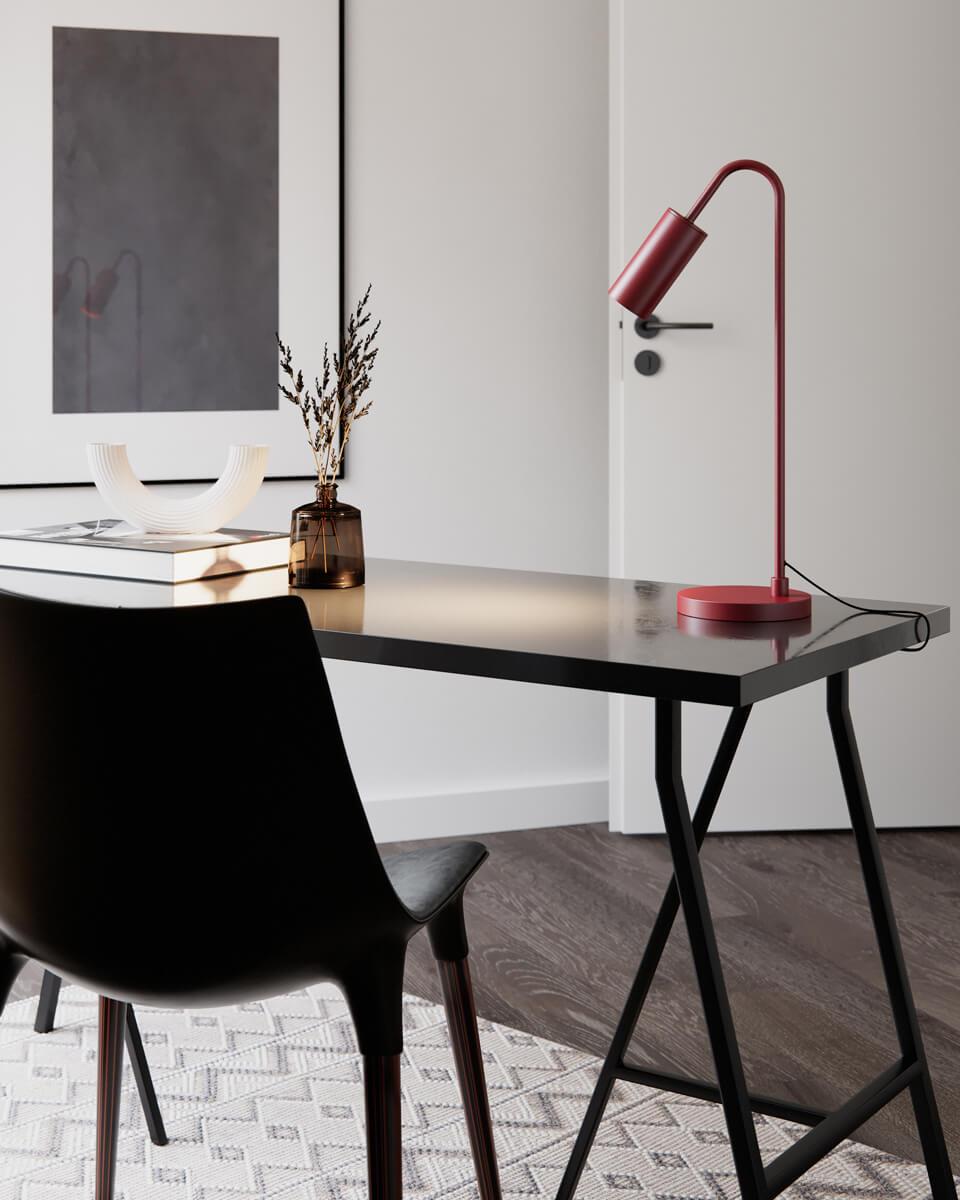 Curve bordslampa finns i färgerna rubinröd, svart samt vit. Den finns även som golvlampa.