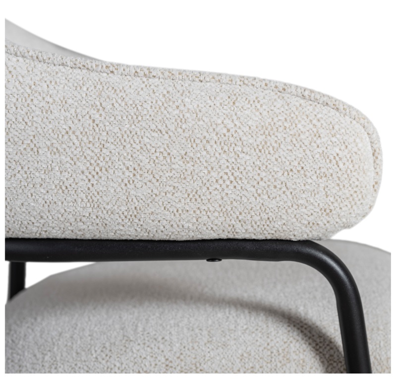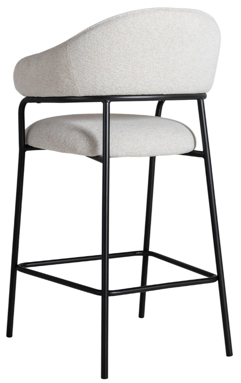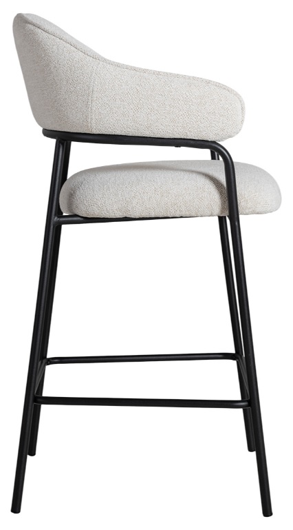 Dalby barstol ger ett sofistikerat intryck med sitt vita bouclétyg och slanka svarta metallram.