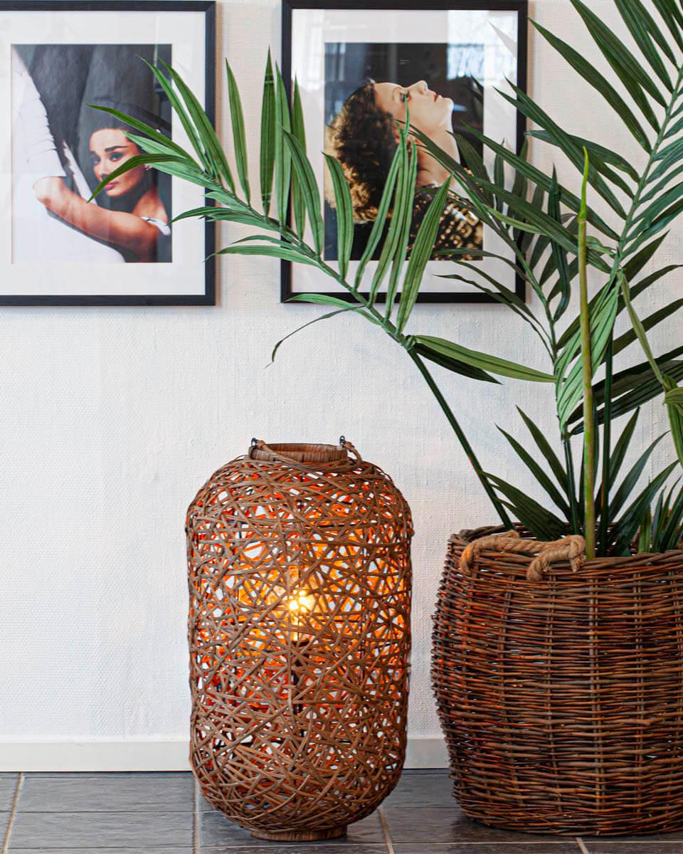 Ställ golvlampan i en helt ny dager. Diego handgjorda golvlampa kommer i vacker rotting i brunt med hålrum, som med en amberfärgad ljuskälla avger det vackraste av sken. Formen liknar en lykta och passar både inomhus och i ett isolerat uterum där den slipper fukt och kyla. Det bekväma handtaget och den långa sladden på 250 cm gör lampan lätt att flytta runt. Måtten på lampan är 65 cm i höjd med en diameter på 35 cm. Ljuskällan till Diego golvlampa måste köpas separat. Det är en sockel E27 med 60 mm i diameter som rekommenderas. Om du vill ha lampan dimbar går det att koppla den mot en dimmer. Denna enkla men ändå speciella och flexibla golvlampa blir garanterat en iögonfallande del av ditt rum och ger ett mysigt ljussken.