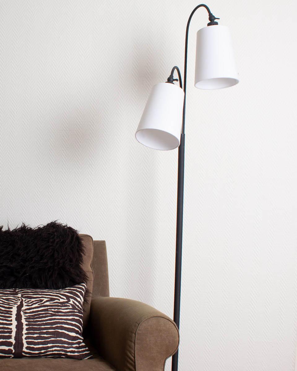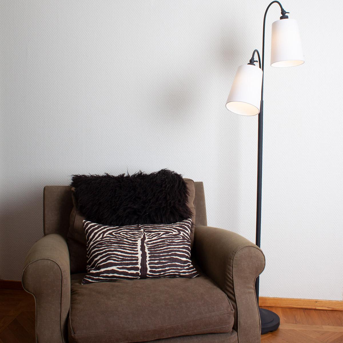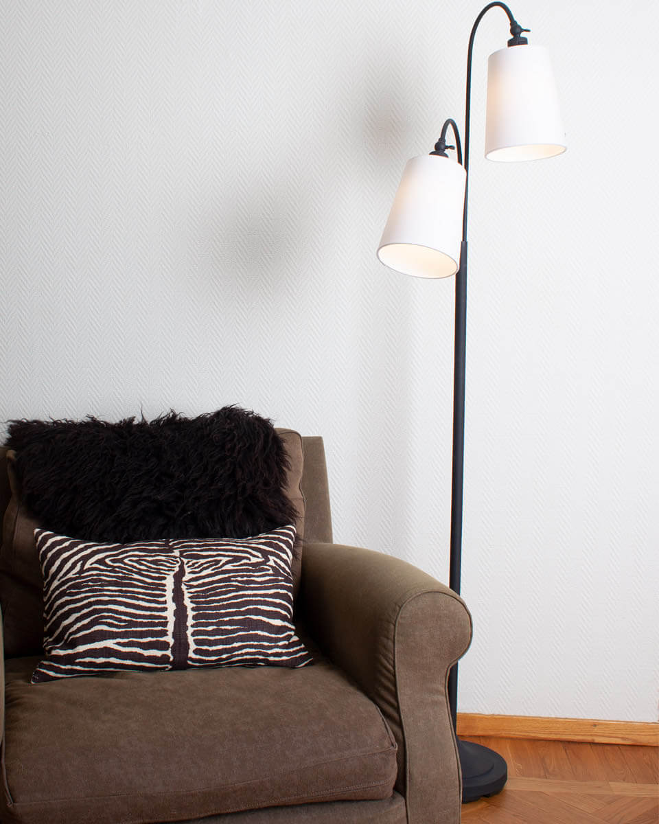 Duetto golvlampa rekommenderas till dig som gillar en klassisk golvlampa som inte tar alltför mycket plats. Lampan är 170 cm hög och i toppen tronar två skärmar som är riktbara. Skärmarna är tillverkade i vit bomull och foten är i svart metall.