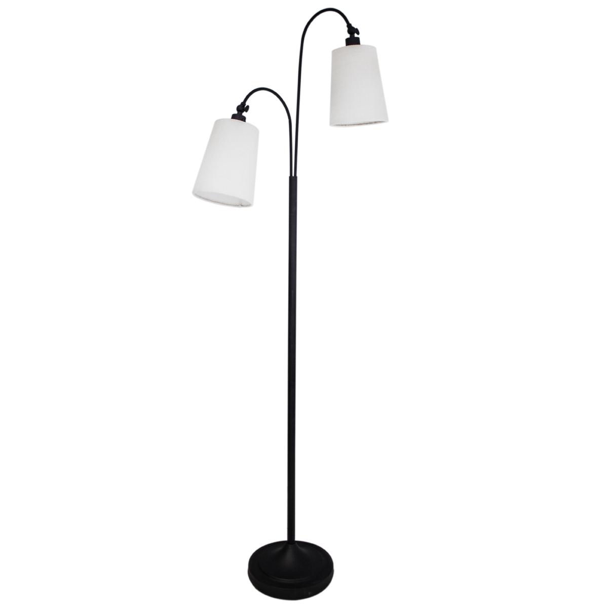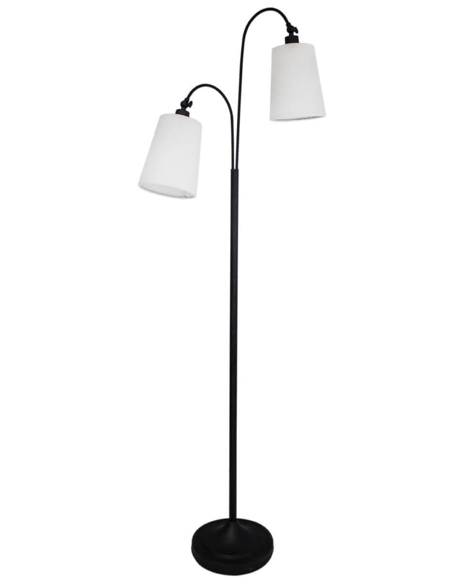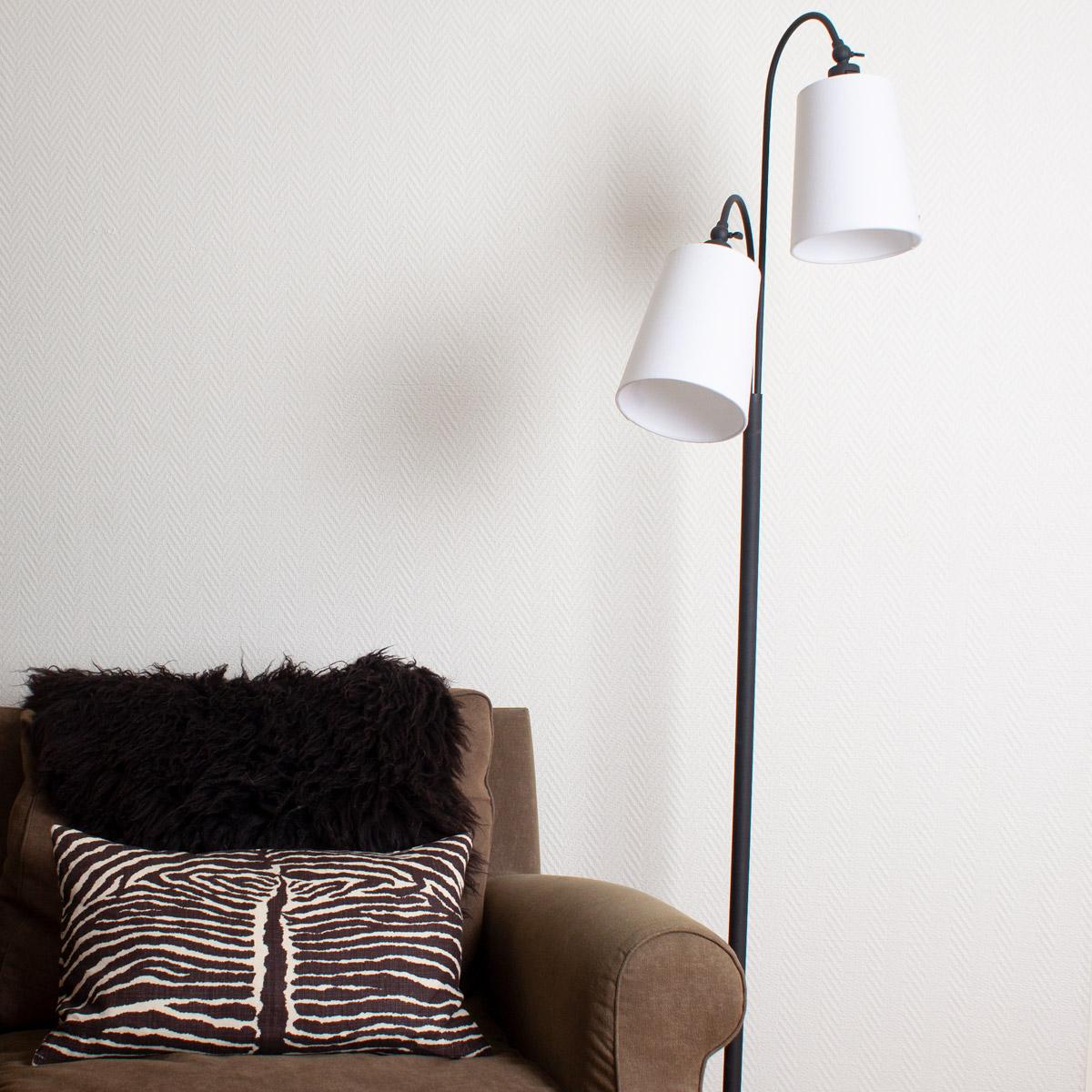 Duetto golvlampa rekommenderas till dig som gillar en klassisk golvlampa som inte tar alltför mycket plats. Lampan är 170 cm hög och i toppen tronar två skärmar som är riktbara. Skärmarna är tillverkade i vit bomull och foten är i svart metall.