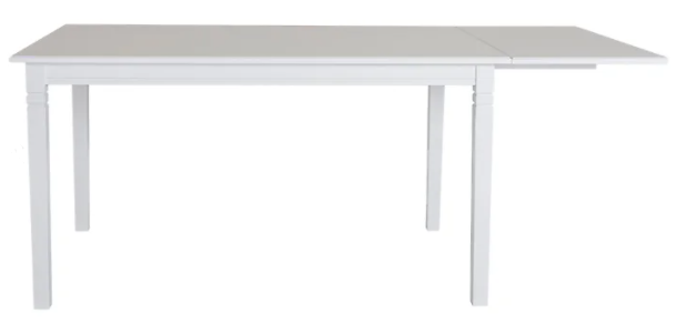 Elvira matbord 140×90 cm i vitlackat trä. Skivan är i MDF och benen är i heveaträ. Tilläggsskiva går att köpa till.