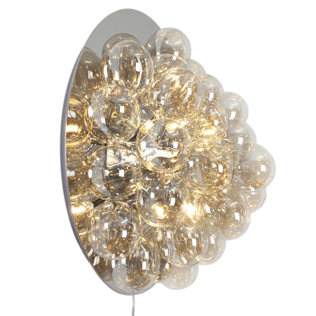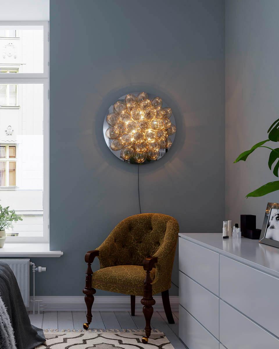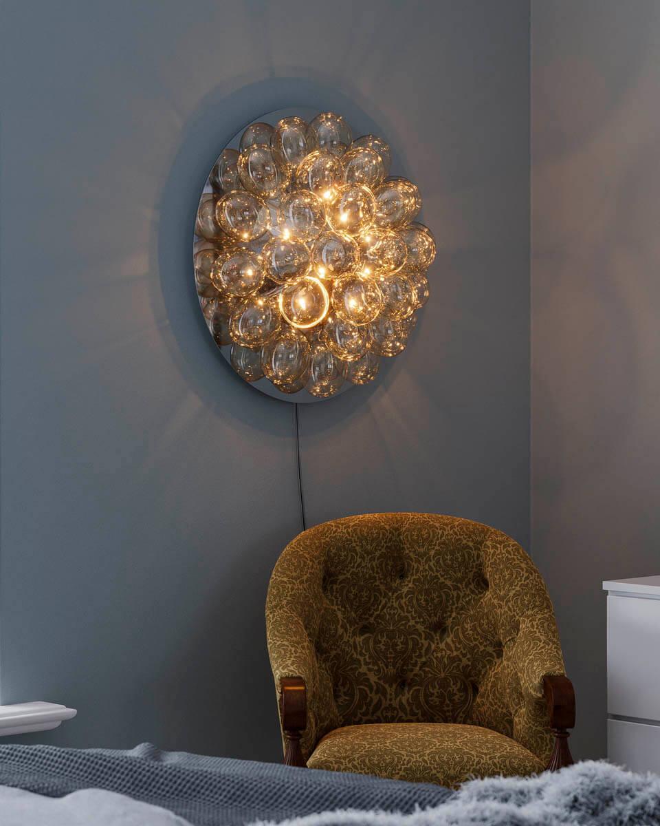 Gross vägglampa passar dig som vill att din vägglampa ska vara mer än bara en lampa. Gross vägglampa är maffig och dekorativ och smyckar din vägg likt ett konstverk. Lampan består av 30 vackra glaskulor, i färgen amber eller rökgrå. Gross vägglampa har en diameter på 60 centimeter och ett djup på 30 centimeter. Glaskulorna har en diameter på 10 centimeter. Sladden till Gross vägglampa är transparant och 2 meter lång och lampan har en inbyggd kvalitetsdimmer. Gross vägglampa är en nykomling i vår populära Grossfamilj och gör sig snygg både i sin ensamhet, som ett komplement till dina tavlor och konstverk eller i samma rum som exempelvis Gross taklampa eller Gross bordslampa. Till Gross vägglampa behöver du 8 ljuskällor med G9 sockel. Vägglampan är enkel att montera upp på väggen med ett fäste och 4 skruvar.