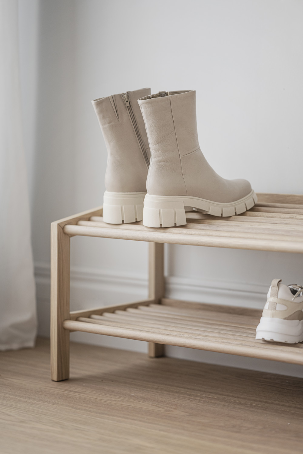 Hillmond skohylla i vitpigmenterad massiv ek har två hyllplan varav det översta hyllplanet är lätt vinklat vilket ger skohyllan en unik och modern design. Kollektionen Hillmond är synonymt med hög kvalitet, vackra trädetaljer och harmonisk skandinavisk design. De runda formerna som möter de raka linjerna skapar en balans som är både vacker och funktionell. Kombinera gärna skohyllan med andra produkter från kollektionen Hillmond för en enhetlig stil.