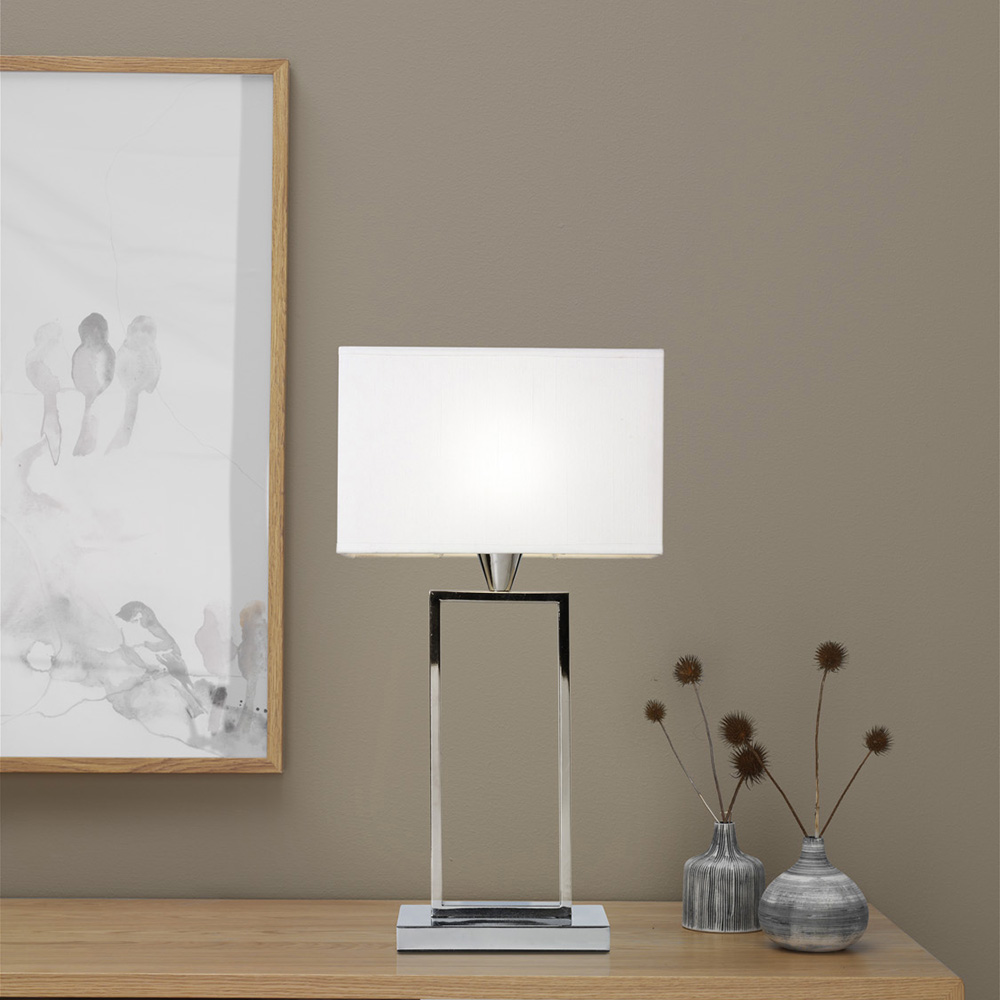 Denna lampa i krom och med vit skärm passar till de flesta hem