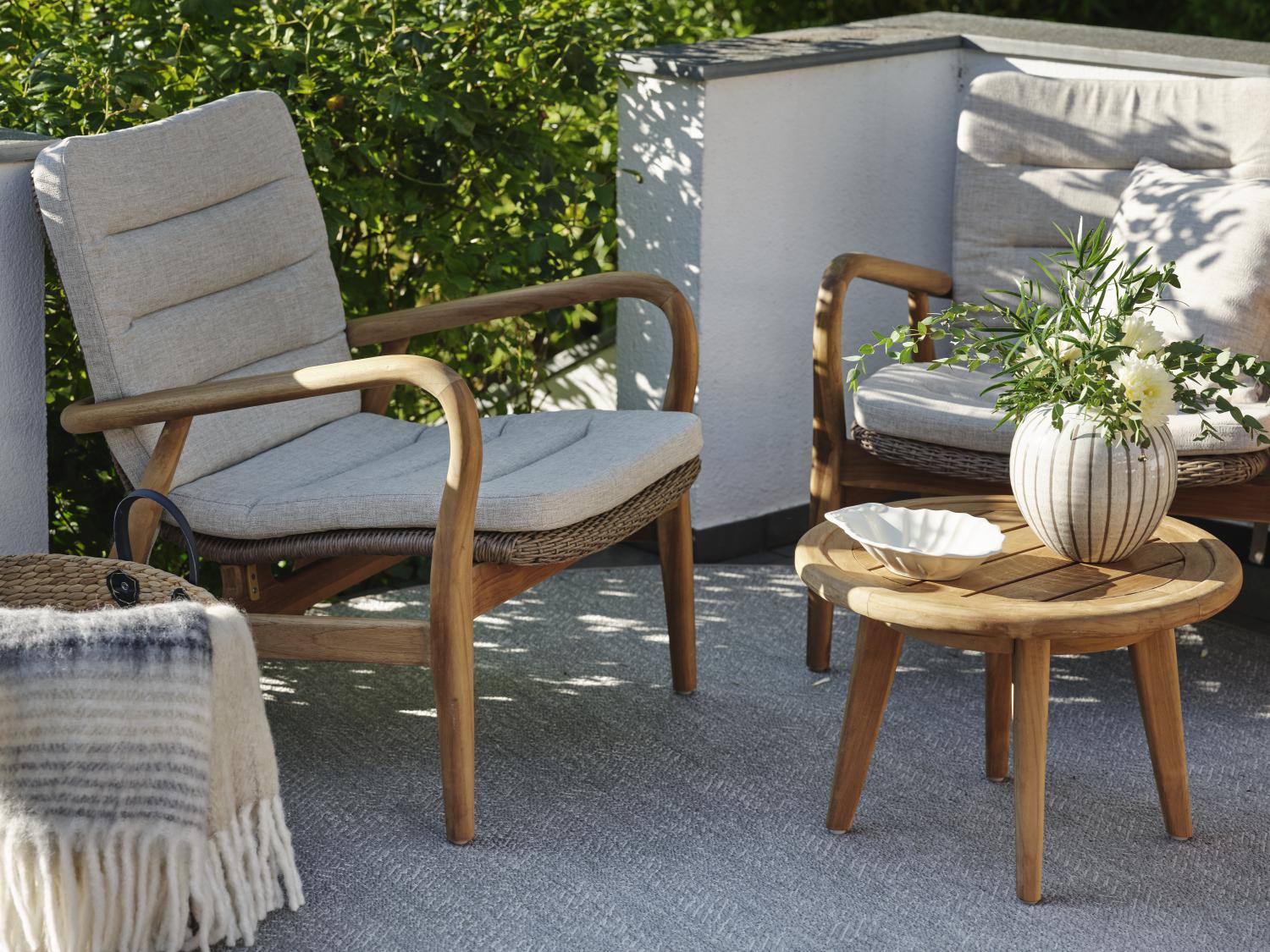 En fåtölj att luta sig tillbaka i. Skön och snygg rundad vinkel för bästa sittkomfort. Snygga armstöd i teak som drar blickarna till sig. Sittdelen finns antingen i stilfulla breda teakribbor eller vävd konstrotting.