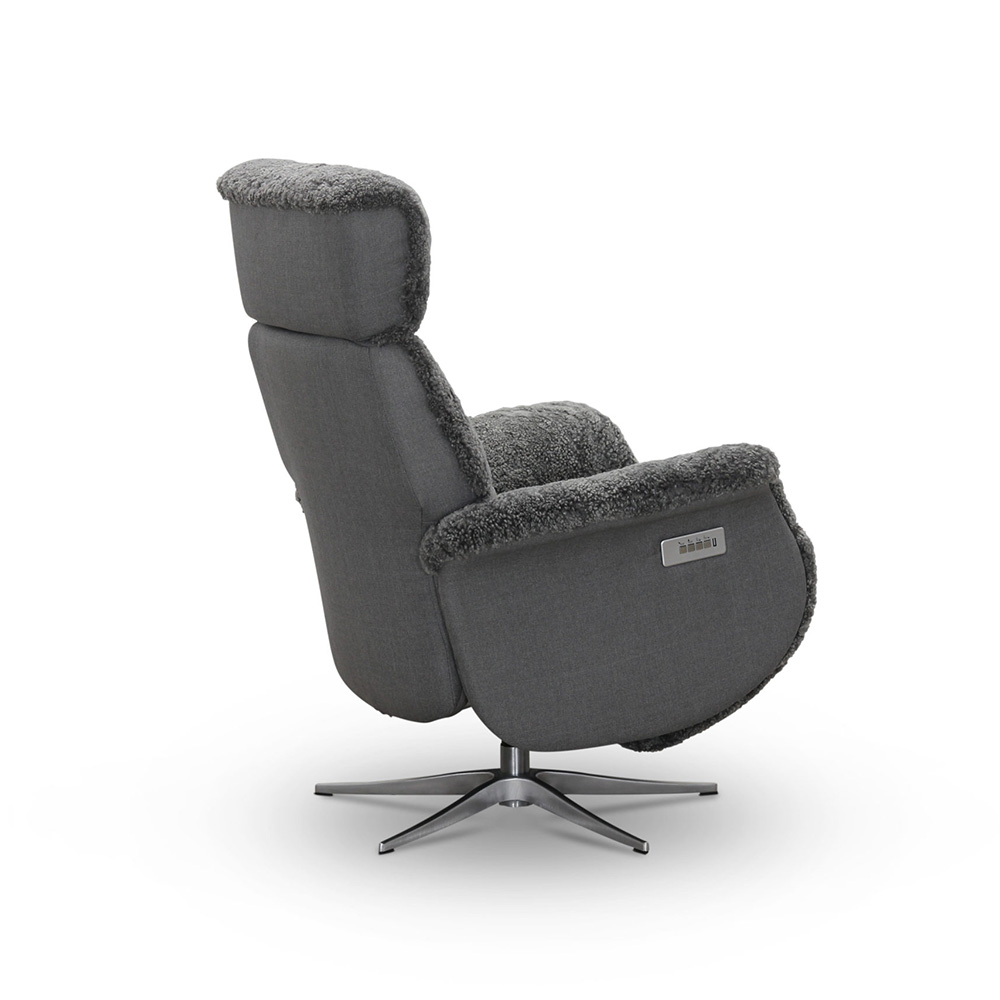 Mysig reclinerfåtölj i ljusgrått fårskinn som styrs med knappar på sidan.