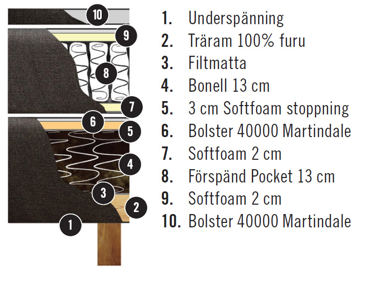 Välj 210, 240, 280 eller 360 cm bredd i tre olika tyger. Hel bäddmadrass.