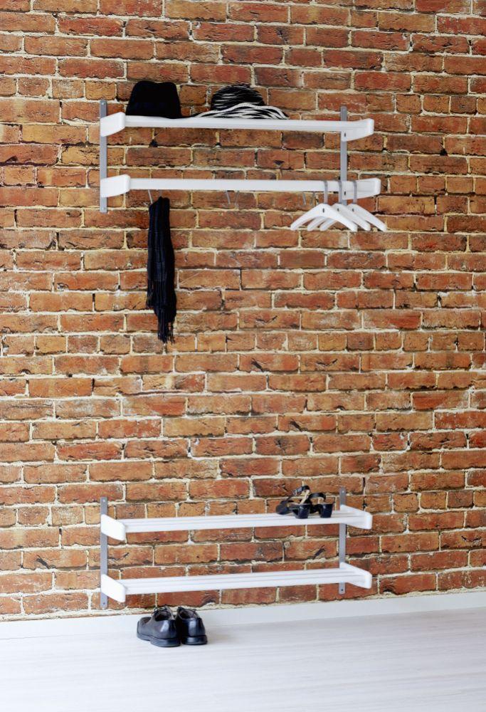 Skohylla, väggmodell med 1 hyllplan och detaljer i slipat stål. Skohyllan är tillverkad i massiv ek eller vitlackad massiv björk.