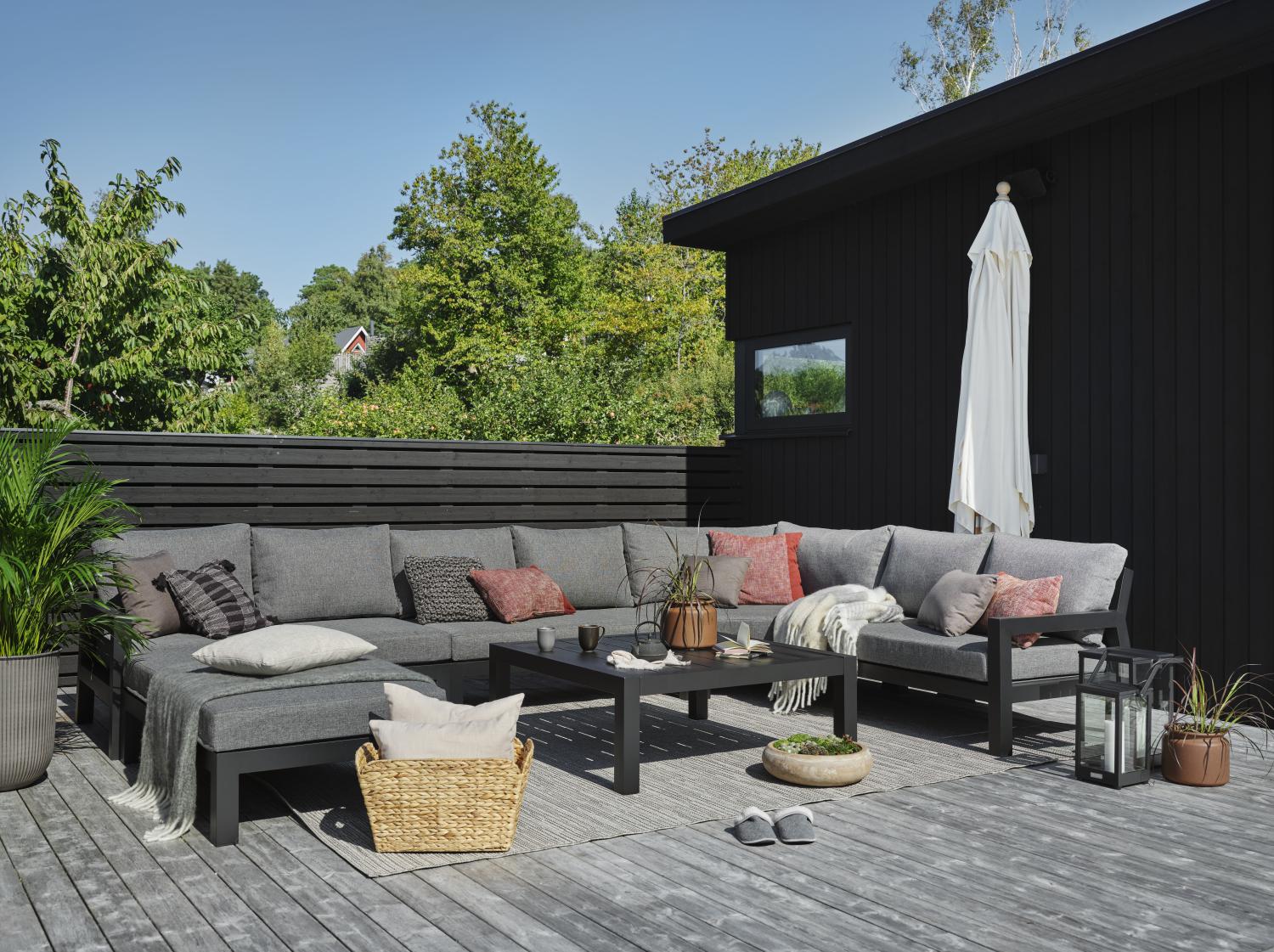 En stor kudde i 100% bomullsgarn med lineffekt. Du väljer mellan färgerna mörkgrå och beige, båda med en dekorativ bård. Innerkudde ingår.