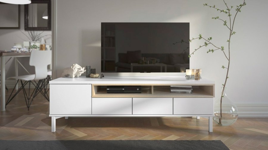 Mediabänken är utrustad med 4 lådor och 2 öppna fack.