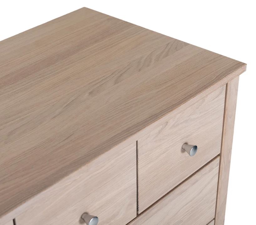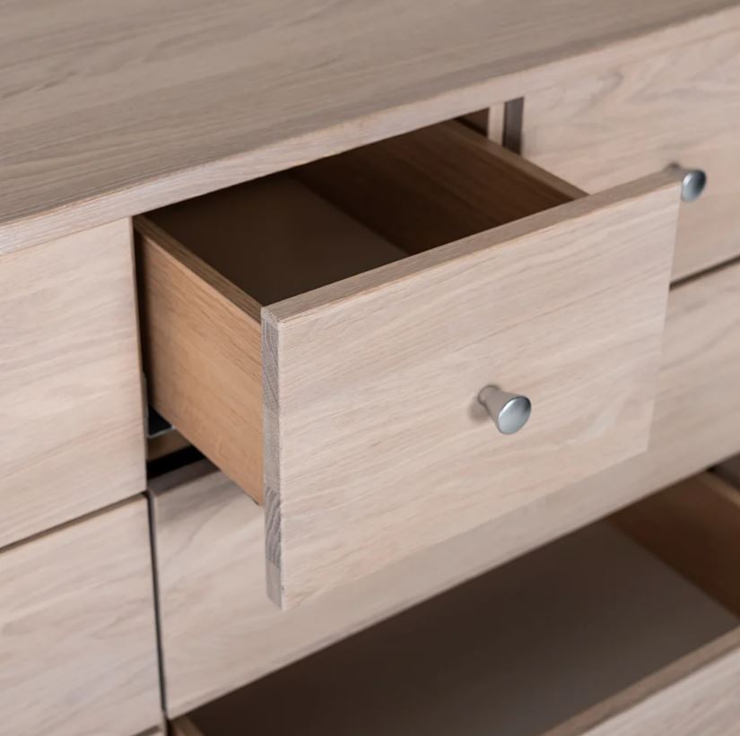 Saga är en stilren och klassisk byrå i massiv vitoljad ek med breda lådor och utrymme för alla dina tillhörigheter.