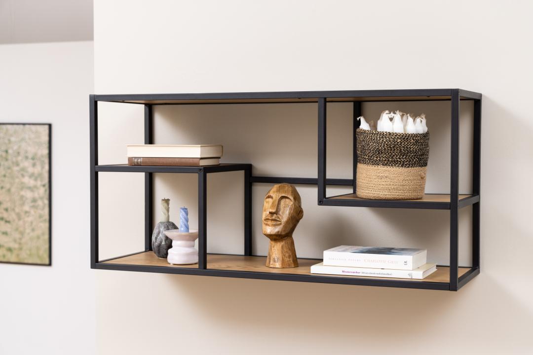 Det är de små personliga sakerna som gör inredningen mysigare, så varför inte ställa ut dem med hjälp av denna öppna ramdesign? Denna vägghylla kan skydda dina personliga favoriter. Insvept i vild ek-look mjukar färgen upp den industriella metallramen, medan det asymmetriska elementet låter ögonen vandra. Faktum är att en sådan kontrasterande look bara gör att dina föremål sticker ut bättre.
