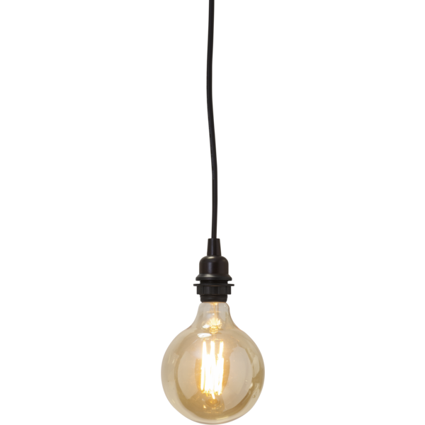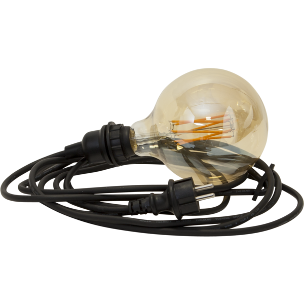 Sladdställ för utomhusbruk, 5m svart gummikabel. Kombinera med en snygg ljuskälla. För E27 sockel. Använd endast ljuskälla med form som tätar runt sockelns gummitätning, för att uppfylla IP44. Max vikt för lampskärm och ljuskälla är 2kg för detta upphäng.