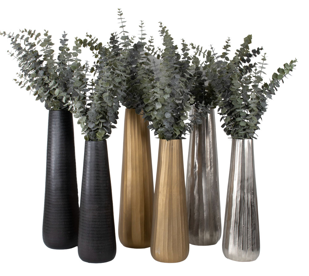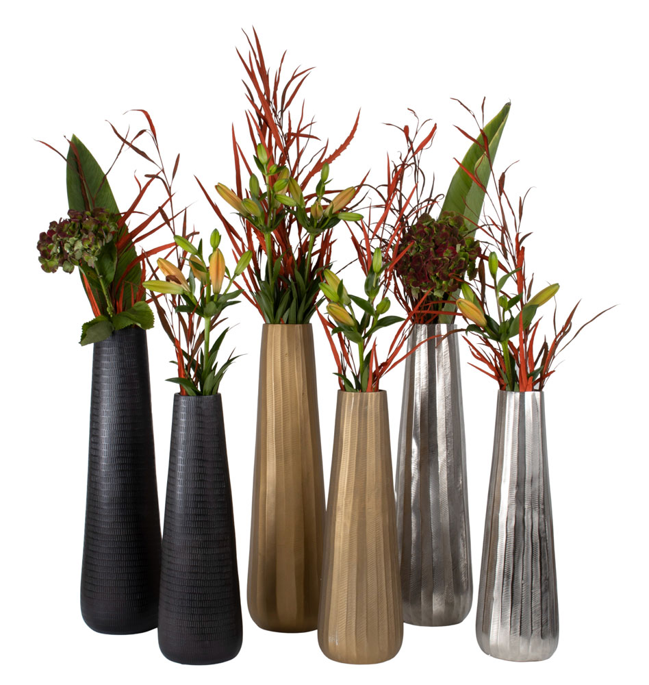 Siverfärgad vas i aluminium, 50 cm i höjd och 16 cm i bottenbredd.