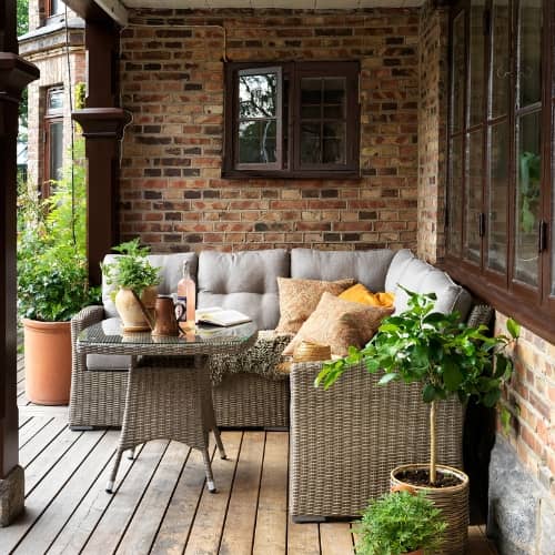 För en balkong eller en mindre uteplats kan du överväga att använda möbler som kan staplas eller fällas ihop när de inte används för att spara utrymme. En liten cafébordsgrupp eller en enkel bänk med dynor kan fungera bra på en mindre yta. Färgerna kan vara ljust och luftigt för att göra ytan mer öppen och rymlig. Tänk också på att använda växter och blommor för att skapa en grön och naturlig känsla på din uteplats. Enkla krukor med gröna växter eller blommor i en rad olika färger kan göra underverk för att skapa en inbjudande atmosfär.