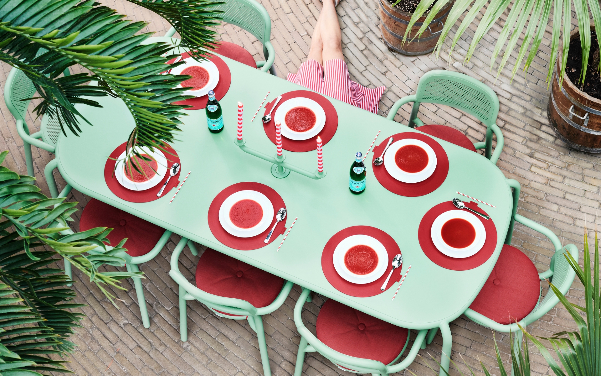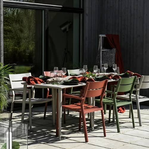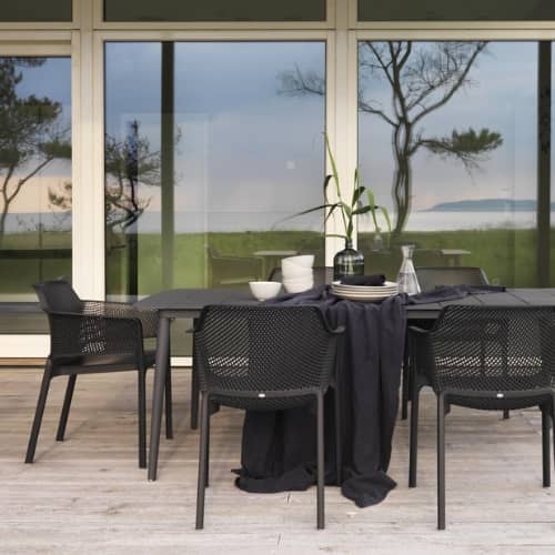 Ett vanligt material för moderna utemöbler. Plastmöbler är lätta att rengöra och tål vatten vilket gör dem till ett praktiskt val för utomhusmiljöer.